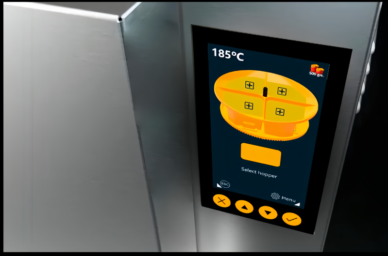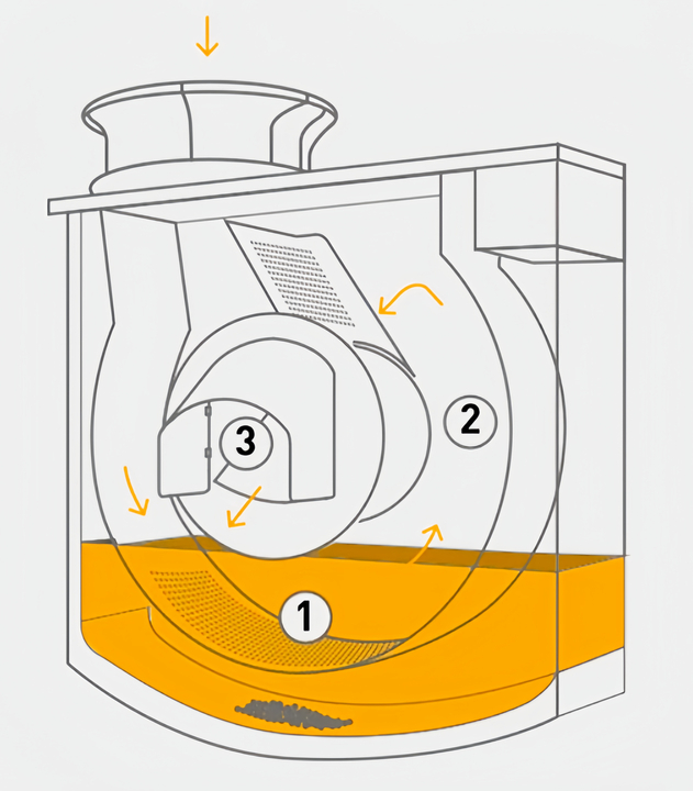 -Переносит пары, образующиеся при жарке, чтобы они циркулировали через конденсационный отсек, охладитель и металлические и угольные фильтры.