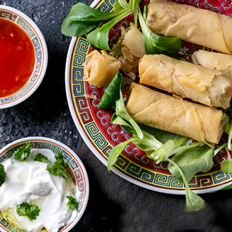 Ингредиенты: 150 граммов козьего сыра, 5 граммов кукурузной муки, 40 граммов теста для спринг-роллов, семена мака и цветы анютиных глазок